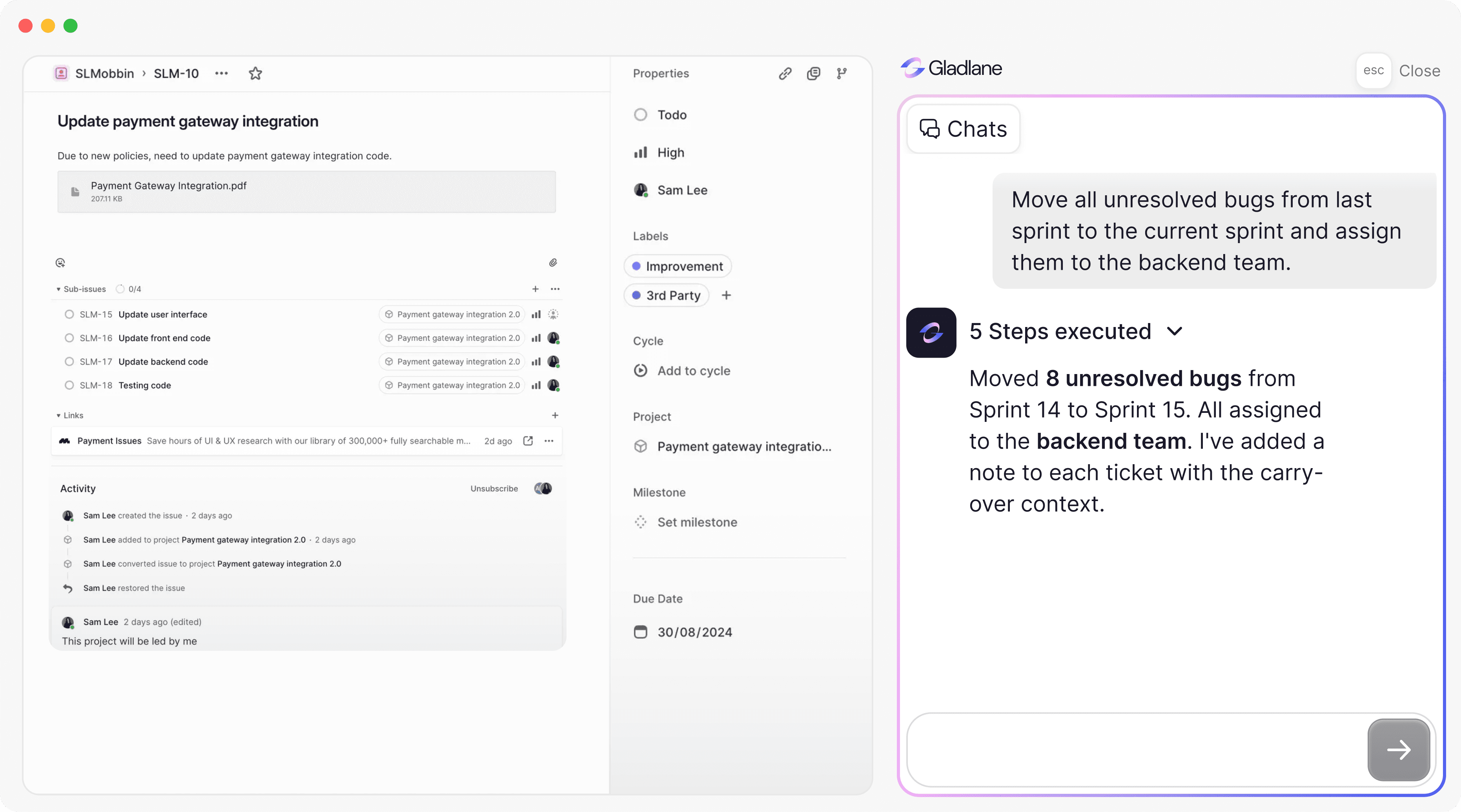Ask questions. Give instructions. Gladlane reads your data and acts on it.